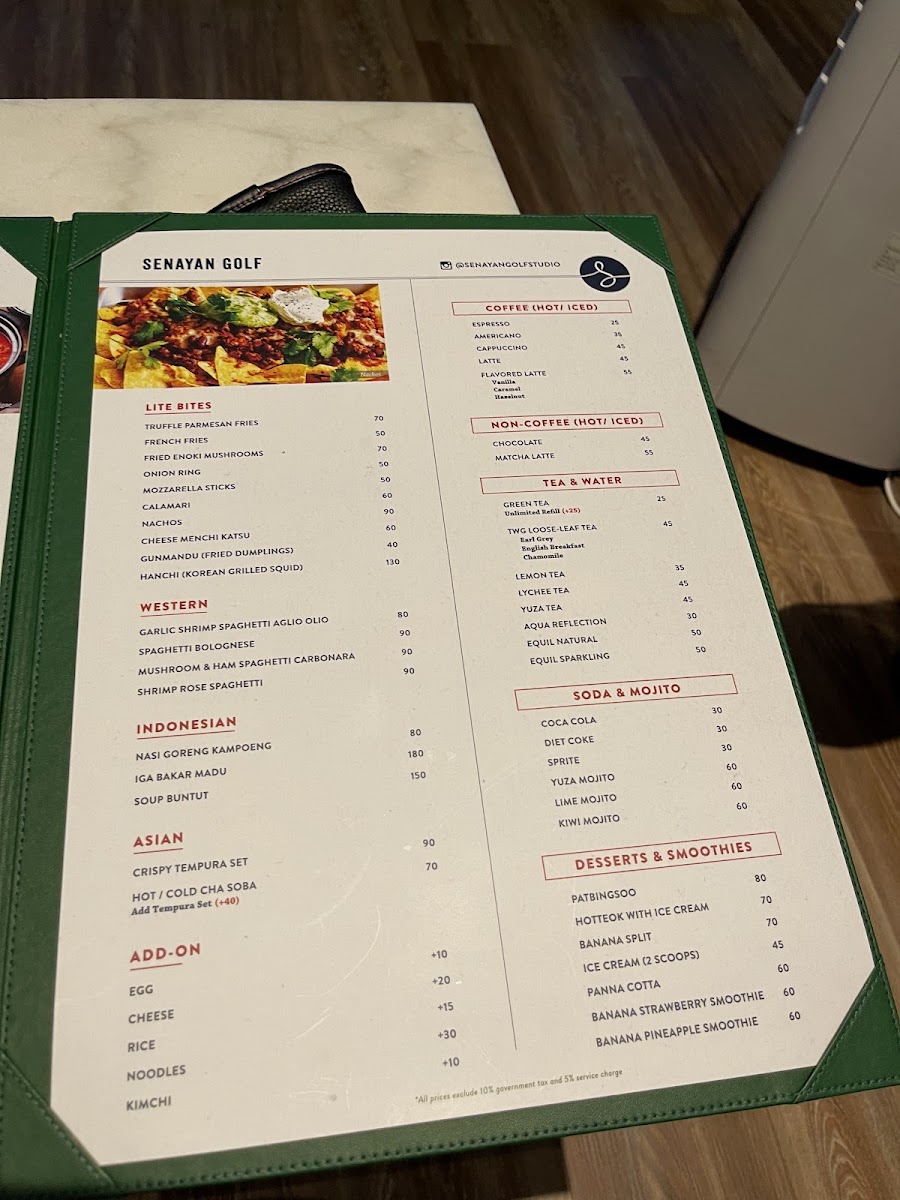 “ I was smitten with my short experience in golf simulator at Senayan Golf Studio two days ago, which made me come back playing there again today. Previously I always feel the golf simulator lacked the feeling and accuracy, especially on short game. Most particularly on putting. But somehow I got a hang of it really well on Friday. I’m not sure if the technology has advanced, or my short game is getting better. Maybe a bit of both I broke 80s on both visits. Although I’m pleased with the score, certainly my real golf round could only wish for that kind of consistency. Too good to be true? Maybe. So I guessed the “Pro” setup in the sim might not be challenging enough. Hence after completing my round, I played another couple of holes, with “Tour” setup, which is more difficult. Sure enough, my mishit shots turned uglier. But I still managed to score few Pars, and few Bogeys. Which is closer to my game in real course. Hence, this is probably the setup I’d use for future visits. In the end, I’m happy to find a great alternative for golf, when, for whatever reason, we can’t be on the real course on weekend. This, at the very least, can cure the “golf bug” with a lot less time and cost commitment. Further more, you can also bring your entire family to watch you conquer another course in Jeju, South Korea. As the place also serve as Cafe. It has plenty options of food and coffee. Cost you 350k rupiah per hour, you can already book a VIP room, in which your family can leisurely chillin while drinking some lattes. If they get bored watching your swing, they could choose to go around the SPARK mall anyway, which is now quite popular place for hang out. A very good option to spend a weekend by playing the game you love with your family. ”